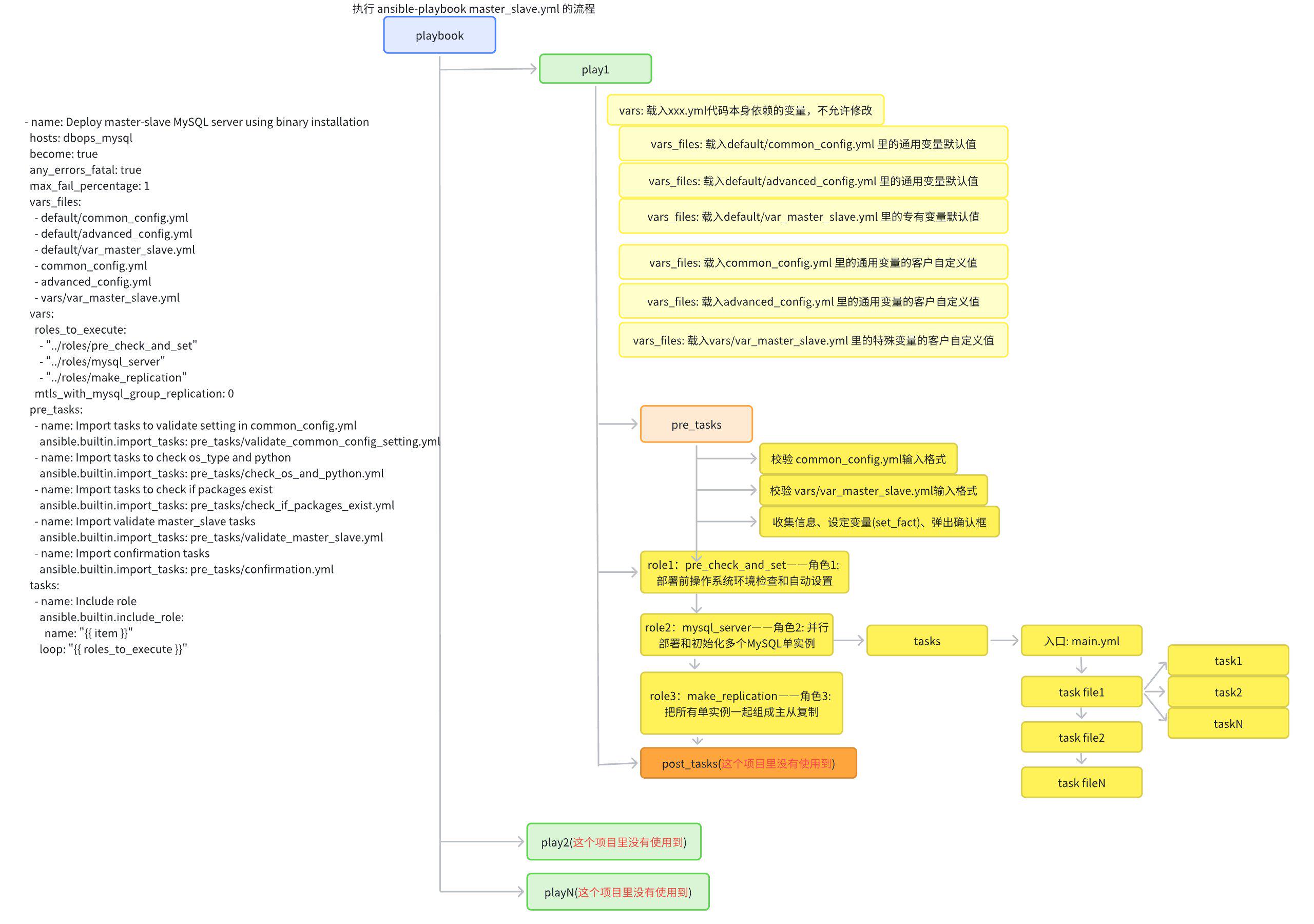 pre_tasks: parameter validation and confirmation prompt.roles: core deployment logic.post_tasks: ending and marking.